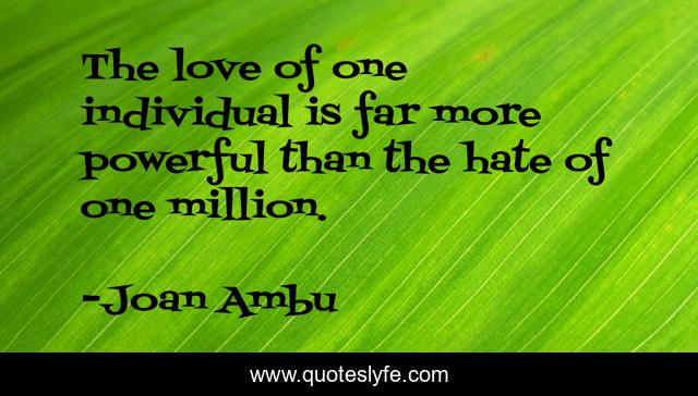 This page presents the quote "The love of one individual is far more powerful than the hate of one million.". Author of this quote is Joan Ambu. This quote is about hope, love, belief, affection,.