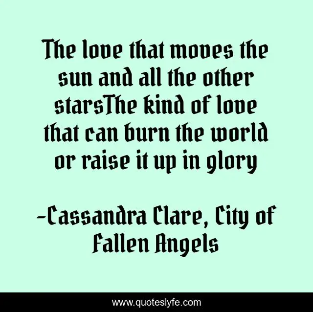 This page presents the quote "The love that moves the sun and all the other starsThe kind of love that can burn the world or raise it up in glory". Author of this quote is Cassandra Clare, City of Fallen Angels. This quote is about cassandra-clare, love, stars, affection,.
