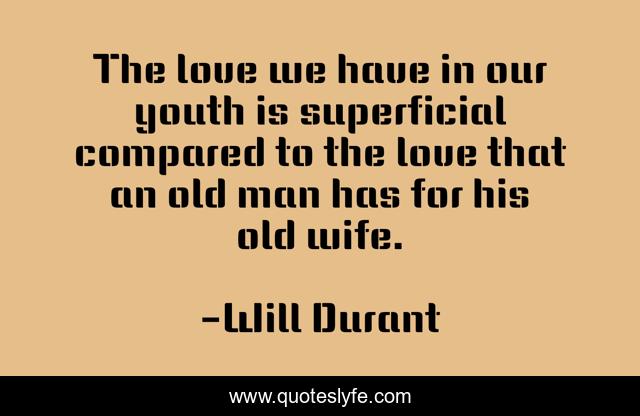 This page presents the quote "The love we have in our youth is superficial compared to the love that an old man has for his old wife.". Author of this quote is Will Durant. This quote is about youth, man, wife,.
