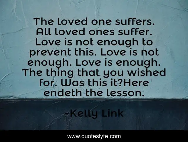 This page presents the quote "The loved one suffers. All loved ones suffer. Love is not enough to prevent this. Love is not enough. Love is enough. The thing that you wished for. Was this it?Here endeth the lesson.". Author of this quote is Kelly Link. This quote is about suffering, love, affection,.