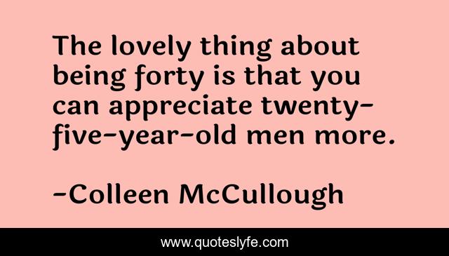 This page presents the quote "The lovely thing about being forty is that you can appreciate twenty-five-year-old men more.". Author of this quote is Colleen McCullough. .
