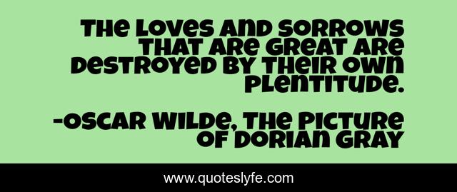 This page presents the quote "The loves and sorrows that are great are destroyed by their own plentitude.". Author of this quote is Oscar Wilde, The Picture of Dorian Gray. This quote is about sorrow, love, affection, greatness,.