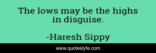 This page presents the quote "The lows may be the highs in disguise.". Author of this quote is Haresh Sippy. This quote is about difficulties, business, obstacles,.