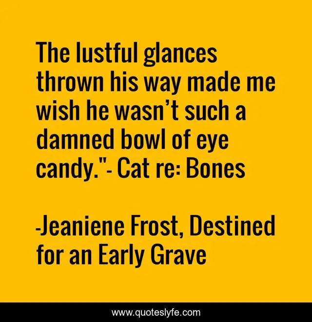 This page presents the quote "The lustful glances thrown his way made me wish he wasn’t such a damned bowl of eye candy."- Cat re: Bones". Author of this quote is Jeaniene Frost, Destined for an Early Grave. This quote is about bones, humor, cat,.