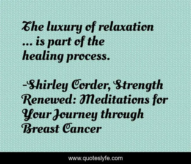 This page presents the quote "The luxury of relaxation ... is part of the healing process.". Author of this quote is Shirley Corder, Strength Renewed: Meditations for Your Journey through Breast Cancer. This quote is about inspiration, treatment, cancer, jesus,.