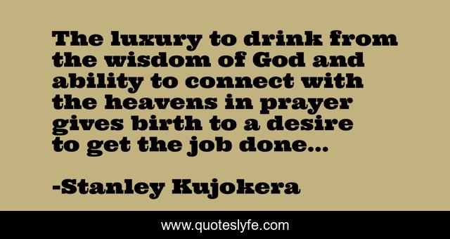 This page presents the quote "The luxury to drink from the wisdom of God and ability to connect with the heavens in prayer gives birth to a desire to get the job done...". Author of this quote is Stanley Kujokera. This quote is about confidence, uplifting, motivational-inspirational, motivational, divine-inspiration, optimistic, inspirational, prayer, enthusiasm,.