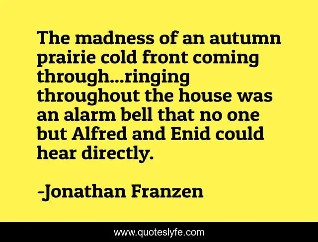 This page presents the quote "The madness of an autumn prairie cold front coming through...ringing throughout the house was an alarm bell that no one but Alfred and Enid could hear directly.". Author of this quote is Jonathan Franzen. This quote is about literature, opening-lines, third-person,.