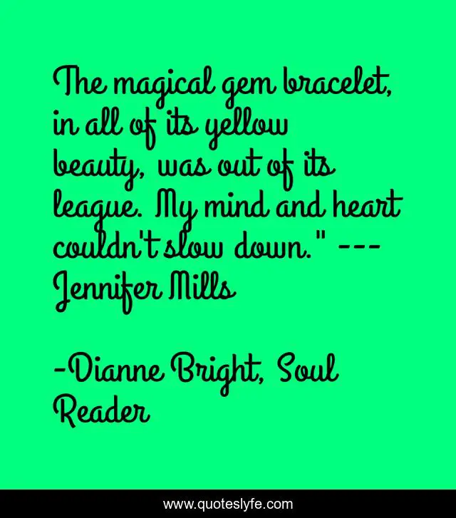 This page presents the quote "The magical gem bracelet, in all of its yellow beauty, was out of its league. My mind and heart couldn't slow down." --- Jennifer Mills". Author of this quote is Dianne Bright, Soul Reader. This quote is about fantasy, women-s-fiction, christian-lit, paranormal, science-fiction,.