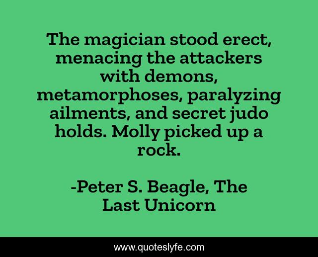 This page presents the quote "The magician stood erect, menacing the attackers with demons, metamorphoses, paralyzing ailments, and secret judo holds. Molly picked up a rock.". Author of this quote is Peter S. Beagle, The Last Unicorn. This quote is about funny, comedy, humor, unicorn,.