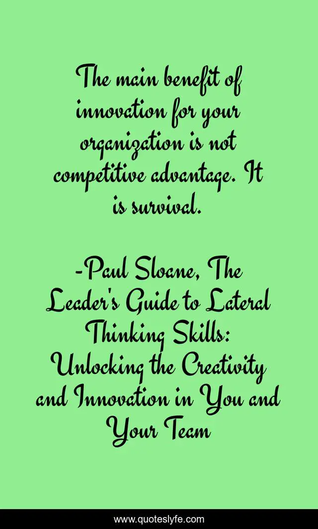 "Paul Sloane, The Leader's Guide to Lateral Thinking Skills: Unlocking the Creativity and Innovation in You and Your Team Quotes." Quoteslyfe.com, 2025. Fri. 05 Dec. 2025. <https://www.quoteslyfe.com/quote/The-main-benefit-of-innovation-for-your-196141>.