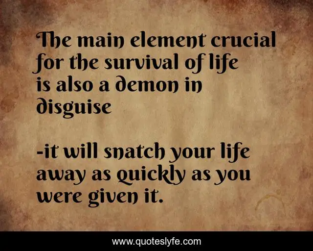 This page presents the quote "The main element crucial for the survival of life is also a demon in disguise". Author of this quote is it will snatch your life away as quickly as you were given it.. This quote is about h2zero: part one, scott a. butler,.