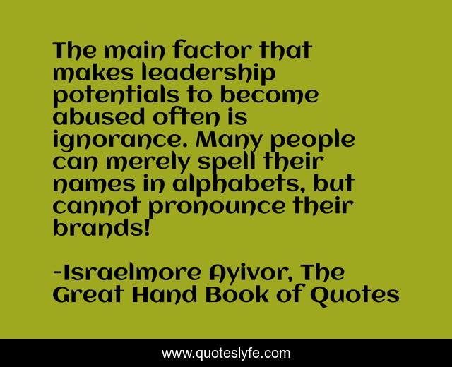 This page presents the quote "The main factor that makes leadership potentials to become abused often is ignorance. Many people can merely spell their names in alphabets, but cannot pronounce their brands!". Author of this quote is Israelmore Ayivor, The Great Hand Book of Quotes. This quote is about ignore, leadership-potentials, potential, leaders, people, personal-branding, brand, pronounce, ignorance,.