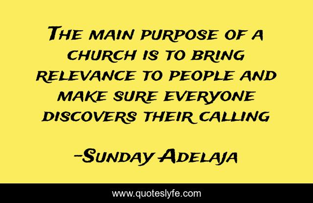 This page presents the quote "The main purpose of a church is to bring relevance to people and make sure everyone discovers their calling". Author of this quote is Sunday Adelaja. This quote is about church, life, relevant, finance, self-discovery, blessing, discovery, calling, job,.