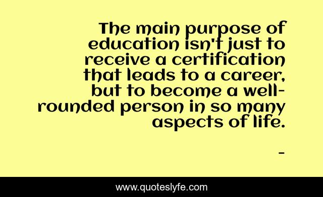 This page presents the quote "The main purpose of education isn't just to receive a certification that leads to a career, but to become a well-rounded person in so many aspects of life.". Author of this quote is . This quote is about a-career-job, certification, career, aspects-of-life, being-certified-for-a-job, edmond-mbiaka, job, becoming-a-well-rounded-person, a-very-well-rounded-person,.