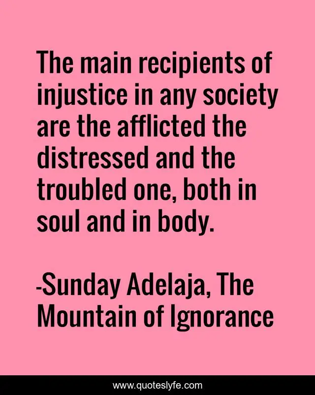 This page presents the quote "The main recipients of injustice in any society are the afflicted the distressed and the troubled one, both in soul and in body.". Author of this quote is Sunday Adelaja, The Mountain of Ignorance. This quote is about body, mountain, life, distress, power, danger, light, people, troubles,.
