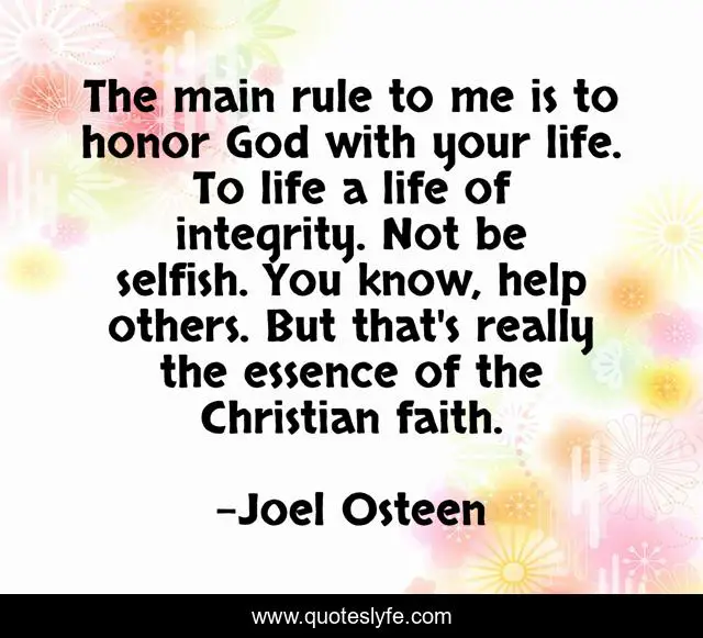 This page presents the quote "The main rule to me is to honor God with your life. To life a life of integrity. Not be selfish. You know, help others. But that's really the essence of the Christian faith.". Author of this quote is Joel Osteen. This quote is about faith, life, integrity,.