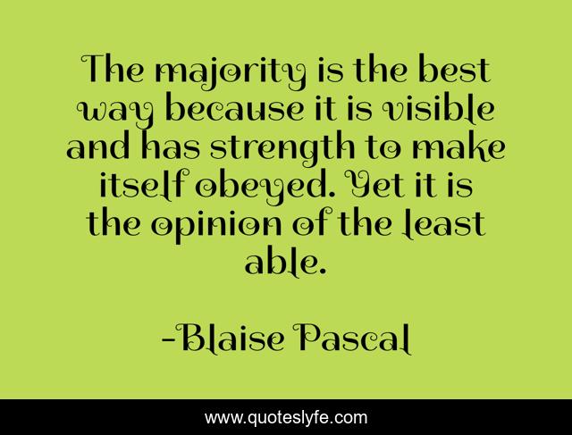 This page presents the quote "The majority is the best way because it is visible and has strength to make itself obeyed. Yet it is the opinion of the least able.". Author of this quote is Blaise Pascal. This quote is about rule, government,.
