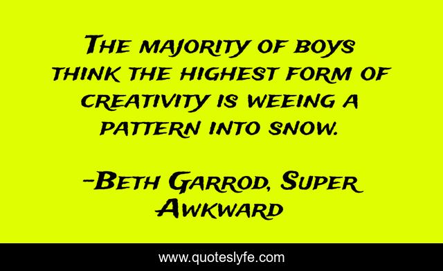 This page presents the quote "The majority of boys think the highest form of creativity is weeing a pattern into snow.". Author of this quote is Beth Garrod, Super Awkward. This quote is about funny, humor, boys, creativity, snow, creative, majority, habits, behavior,.