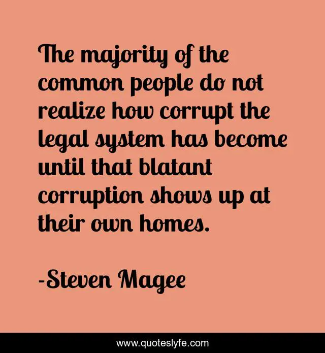 This page presents the quote "The majority of the common people do not realize how corrupt the legal system has become until that blatant corruption shows up at their own homes.". Author of this quote is Steven Magee. This quote is about own, dwelling, people, house, system, legal, up, majority, blatant,.