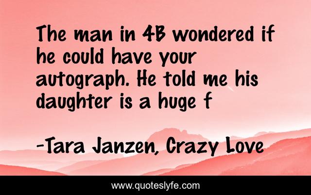 This page presents the quote "The man in 4B wondered if he could have your autograph. He told me his daughter is a huge f". Author of this quote is Tara Janzen, Crazy Love. This quote is about funny, contemporary-romance, humour, romance, romantic-suspense, comedy,.