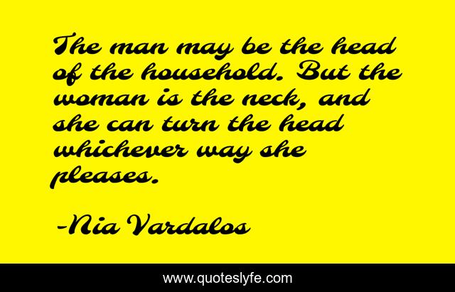 This page presents the quote "The man may be the head of the household. But the woman is the neck, and she can turn the head whichever way she pleases.". Author of this quote is Nia Vardalos. This quote is about funny, comedy, marriage,.