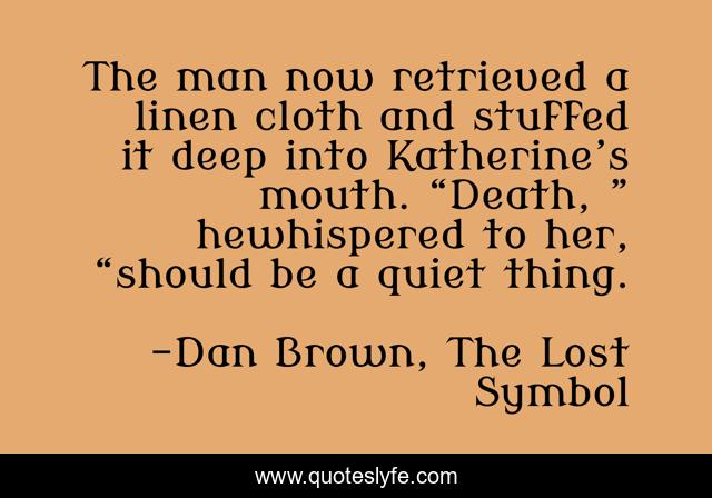 This page presents the quote "The man now retrieved a linen cloth and stuffed it deep into Katherine’s mouth. “Death, ” hewhispered to her, “should be a quiet thing.". Author of this quote is Dan Brown, The Lost Symbol. .