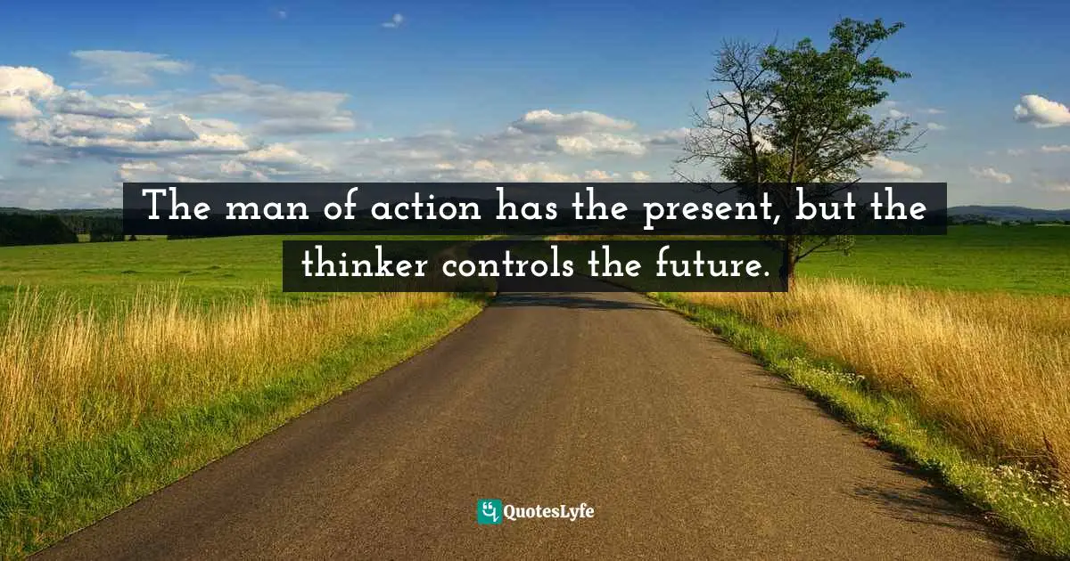 This page presents the quote "The man of action has the present, but the thinker controls the future.". Author of this quote is Oliver Wendell Holmes Jr., The Essential Holmes: Selections from the Letters, Speeches, Judicial Opinions, and Other Writings of Oliver Wendell Holmes, Jr.. This quote is about intellectuals, thinking,.