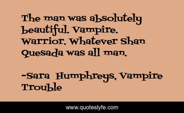This page presents the quote "The man was absolutely beautiful. Vampire. Warrior. Whatever Shan Quesada was all man.". Author of this quote is Sara Humphreys, Vampire Trouble. This quote is about romance, werewolves, gypsies, vampires, paranormal,.