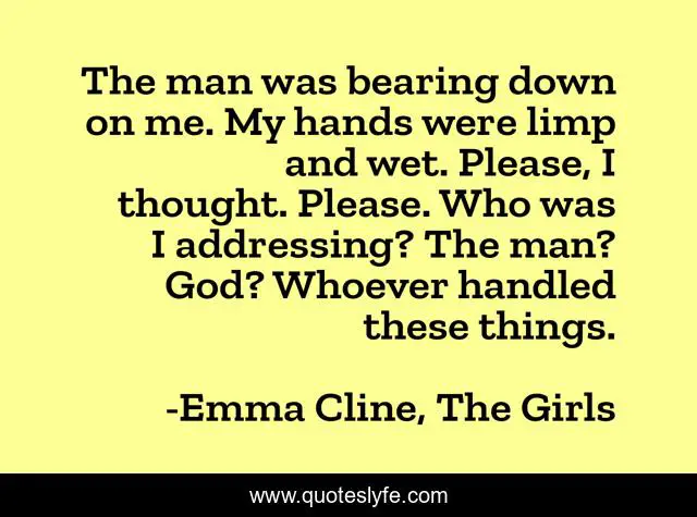 This page presents the quote "The man was bearing down on me. My hands were limp and wet. Please, I thought. Please. Who was I addressing? The man? God? Whoever handled these things.". Author of this quote is Emma Cline, The Girls. .