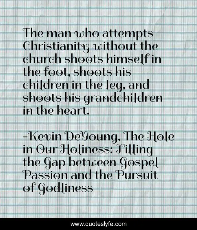 This page presents the quote "The man who attempts Christianity without the church shoots himself in the foot, shoots his children in the leg, and shoots his grandchildren in the heart.". Author of this quote is Kevin DeYoung, The Hole in Our Holiness: Filling the Gap between Gospel Passion and the Pursuit of Godliness. This quote is about churches, grandchild, children, grandchildren,.