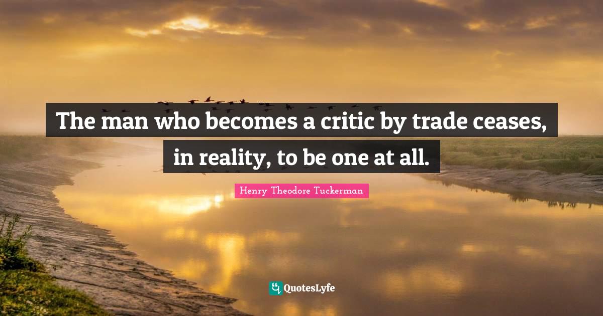 This page presents the quote "The man who becomes a critic by trade ceases, in reality, to be one at all.". Author of this quote is Henry Theodore Tuckerman. This quote is about reality, he man, trade, men,.