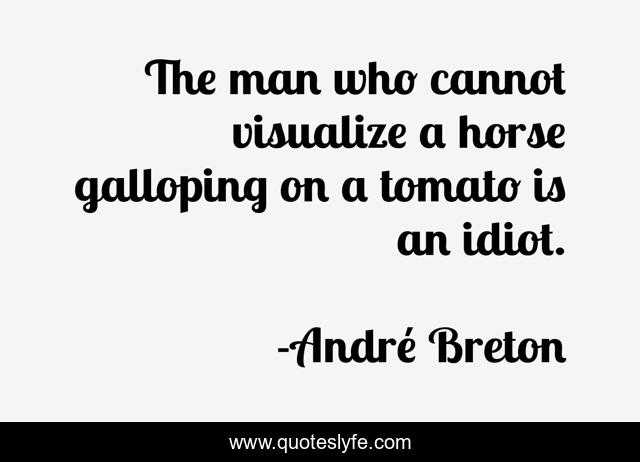 This page presents the quote "The man who cannot visualize a horse galloping on a tomato is an idiot.". Author of this quote is André Breton. This quote is about imagination, art,.