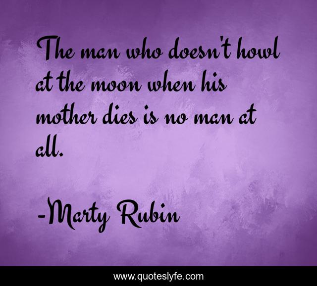 This page presents the quote "The man who doesn't howl at the moon when his mother dies is no man at all.". Author of this quote is Marty Rubin. This quote is about grief, loss, men,.
