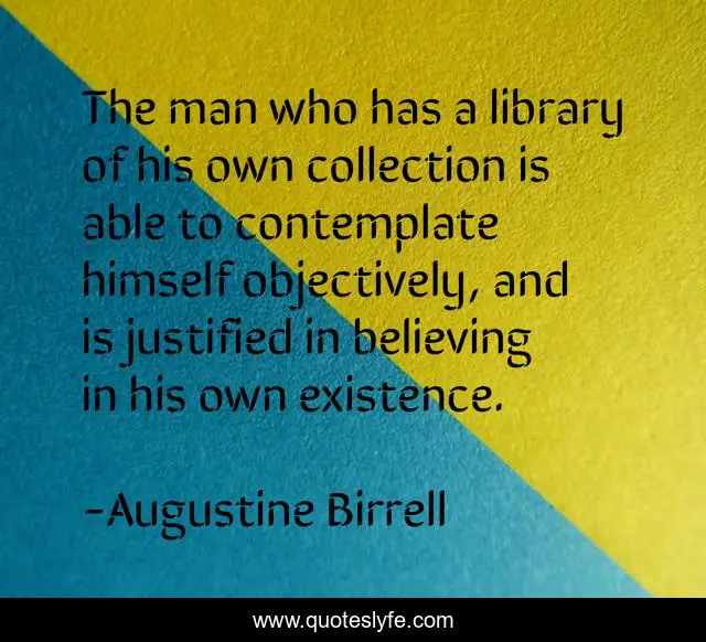 This page presents the quote "The man who has a library of his own collection is able to contemplate himself objectively, and is justified in believing in his own existence.". Author of this quote is Augustine Birrell. This quote is about libraries, existence, contemplation,.