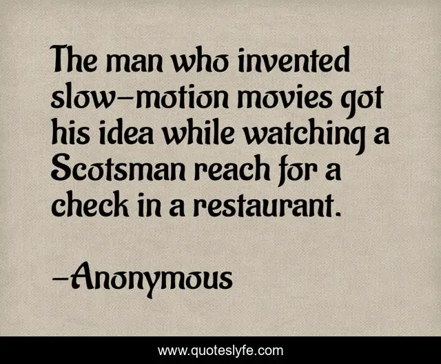 This page presents the quote "The man who invented slow-motion movies got his idea while watching a Scotsman reach for a check in a restaurant.". Author of this quote is Anonymous. .
