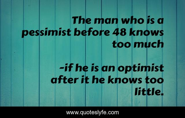 This page presents the quote "The man who is a pessimist before 48 knows too much". Author of this quote is if he is an optimist after it he knows too little.. .