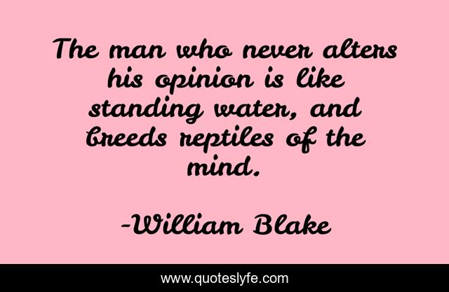 This page presents the quote "The man who never alters his opinion is like standing water, and breeds reptiles of the mind.". Author of this quote is William Blake. This quote is about thought, opinions,.