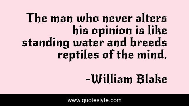 This page presents the quote "The man who never alters his opinion is like standing water and breeds reptiles of the mind.". Author of this quote is William Blake. This quote is about positive, confidence, creating, change,.