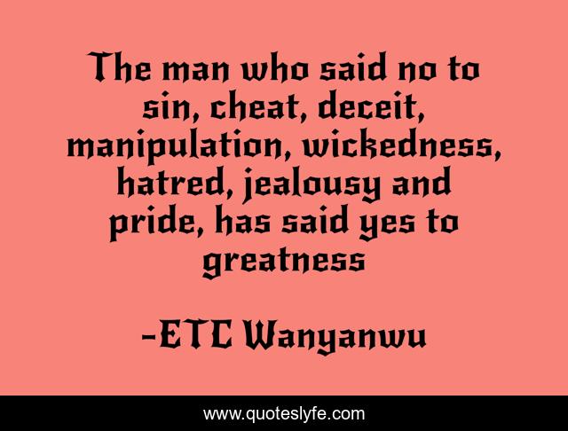 This page presents the quote "The man who said no to sin, cheat, deceit, manipulation, wickedness, hatred, jealousy and pride, has said yes to greatness". Author of this quote is ETC Wanyanwu. This quote is about confidence, positive, motivational, optimistic, inspirational, greatness, enthusiasm,.