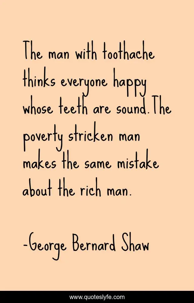 This page presents the quote "The man with toothache thinks everyone happy whose teeth are sound.The poverty stricken man makes the same mistake about the rich man.". Author of this quote is George Bernard Shaw. This quote is about money, poverty, happiness,.