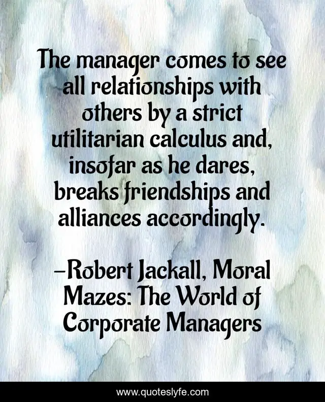 This page presents the quote "The manager comes to see all relationships with others by a strict utilitarian calculus and, insofar as he dares, breaks friendships and alliances accordingly.". Author of this quote is Robert Jackall, Moral Mazes: The World of Corporate Managers. This quote is about management, leadership,.