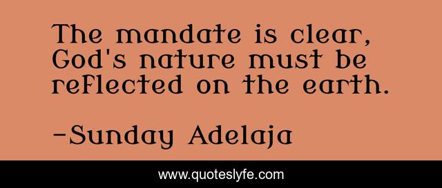 This page presents the quote "The mandate is clear, God's nature must be reflected on the earth.". Author of this quote is Sunday Adelaja. This quote is about be, nature, clear, reflected, god-s, mandate, earth,.