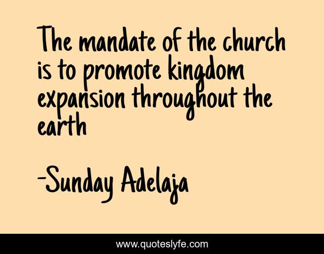 This page presents the quote "The mandate of the church is to promote kingdom expansion throughout the earth". Author of this quote is Sunday Adelaja. This quote is about earth, church, mandate,.