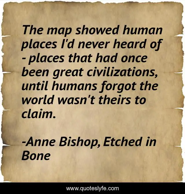 This page presents the quote "The map showed human places I'd never heard of - places that had once been great civilizations, until humans forgot the world wasn't theirs to claim.". Author of this quote is Anne Bishop, Etched in Bone. This quote is about civilizations, humans, destruction,.