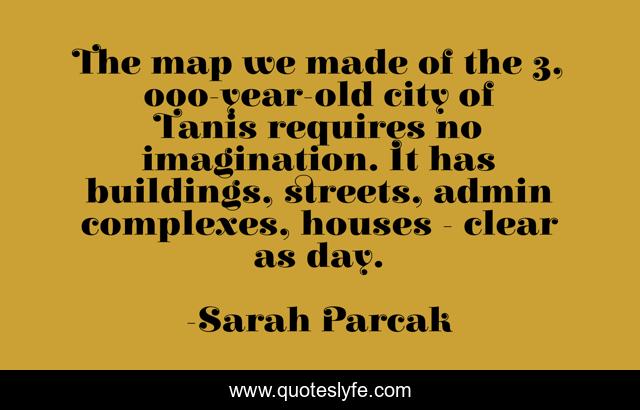 This page presents the quote "The map we made of the 3, 000-year-old city of Tanis requires no imagination. It has buildings, streets, admin complexes, houses - clear as day.". Author of this quote is Sarah Parcak. This quote is about city, day, map,.