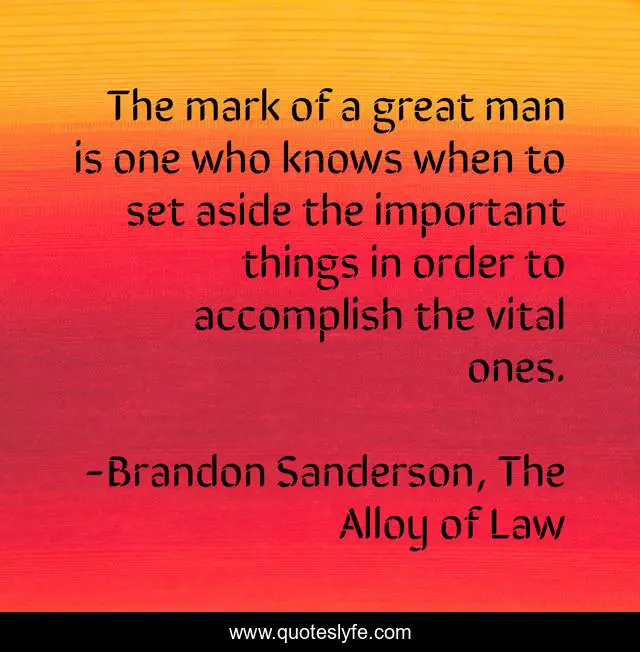 This page presents the quote "The mark of a great man is one who knows when to set aside the important things in order to accomplish the vital ones.". Author of this quote is Brandon Sanderson, The Alloy of Law. This quote is about leadership, priorities, greatness,.