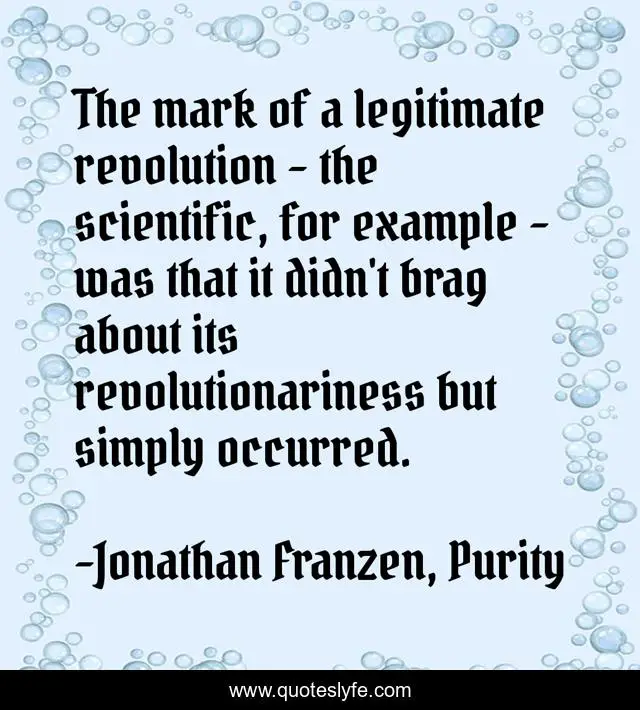 This page presents the quote "The mark of a legitimate revolution - the scientific, for example - was that it didn't brag about its revolutionariness but simply occurred.". Author of this quote is Jonathan Franzen, Purity. .