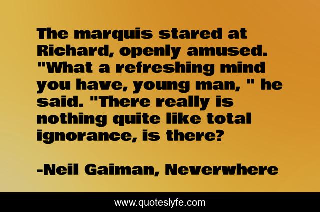 This page presents the quote "The marquis stared at Richard, openly amused. "What a refreshing mind you have, young man, " he said. "There really is nothing quite like total ignorance, is there?". Author of this quote is Neil Gaiman, Neverwhere. .