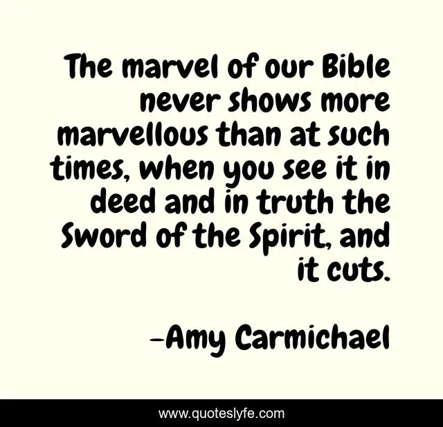 This page presents the quote "The marvel of our Bible never shows more marvellous than at such times, when you see it in deed and in truth the Sword of the Spirit, and it cuts.". Author of this quote is Amy Carmichael. .