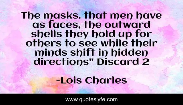 This page presents the quote "The masks. that men have as faces, the outward shells they hold up for others to see while their minds shift in hidden directions" Discard 2". Author of this quote is Lois Charles. This quote is about discard2, novel, philadelphia, loischarles,.